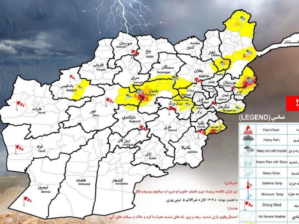 د یاد وزارت په خبرپاڼه کې ویل شوي چې سبا (چهارشنبې، د غبرګولي ۶مه) په بدخشان، تخار، نورستان، کونړ، لغمان، ننګرهار، کابل، لوګر، پکتیا پنجشیر، پروان، بغلان، بامیان او میدان وردګ ولایتونو کې د ورښت اټکل شته.