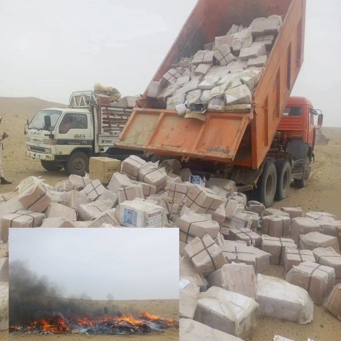 ياد وزارت وايي، چې دا خوراکي توکي او درمل د هلمند عامې روغتیا ریاست مسوولینو له لوري د همدې ولایت سنګین ولسوالۍ کې راټول شوي وو او د اړوندو ادارو د استازو په شتون کې له منځه یووړل شوي دي.