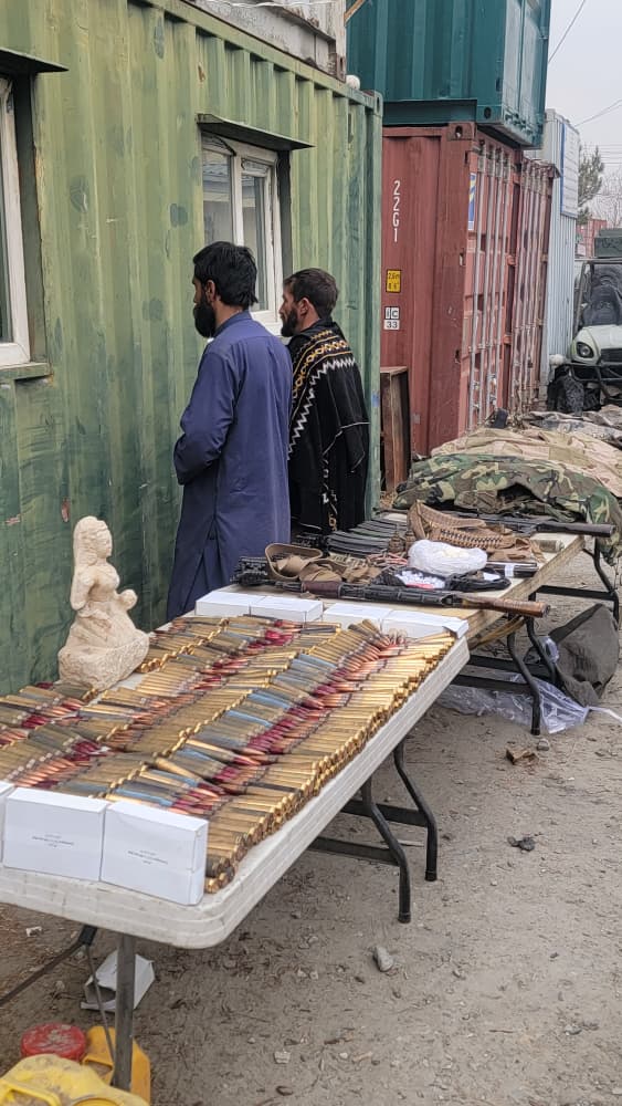 According to the police, the two men were detained from a house in the “Karataz” area of Mahmud Raqi city, with several light firearms, two hand grenades, hundreds of bullets, 16 magazines, military equipment, approximately 200 grams of drugs (including hashish and opium), and a stone statue.
