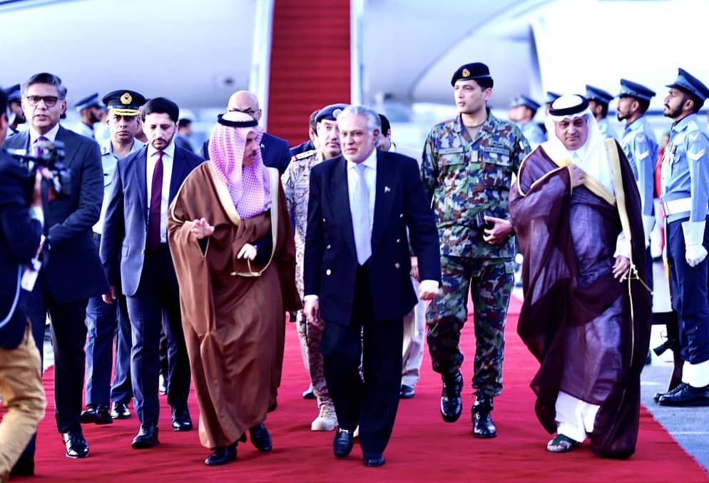 وزیر امور خارجه عربستان سعودی در اسلامآباد مورد استقبال گرم مقامهای پاکستان از جمله محمد اسحق دار، وزیر امور خارجه این کشور، قرار گرفته است.