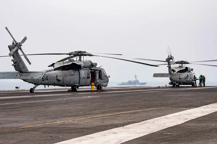 ناوگان امریکا مستقر در اقیانوس آرام گفته که چرخبال نوع MH-60R Sea Hawk موسوم به «پشکهای جنگی» در جریان عملیات سقوط کرده و هر سه خدمه آن نجات داده شدهاند.